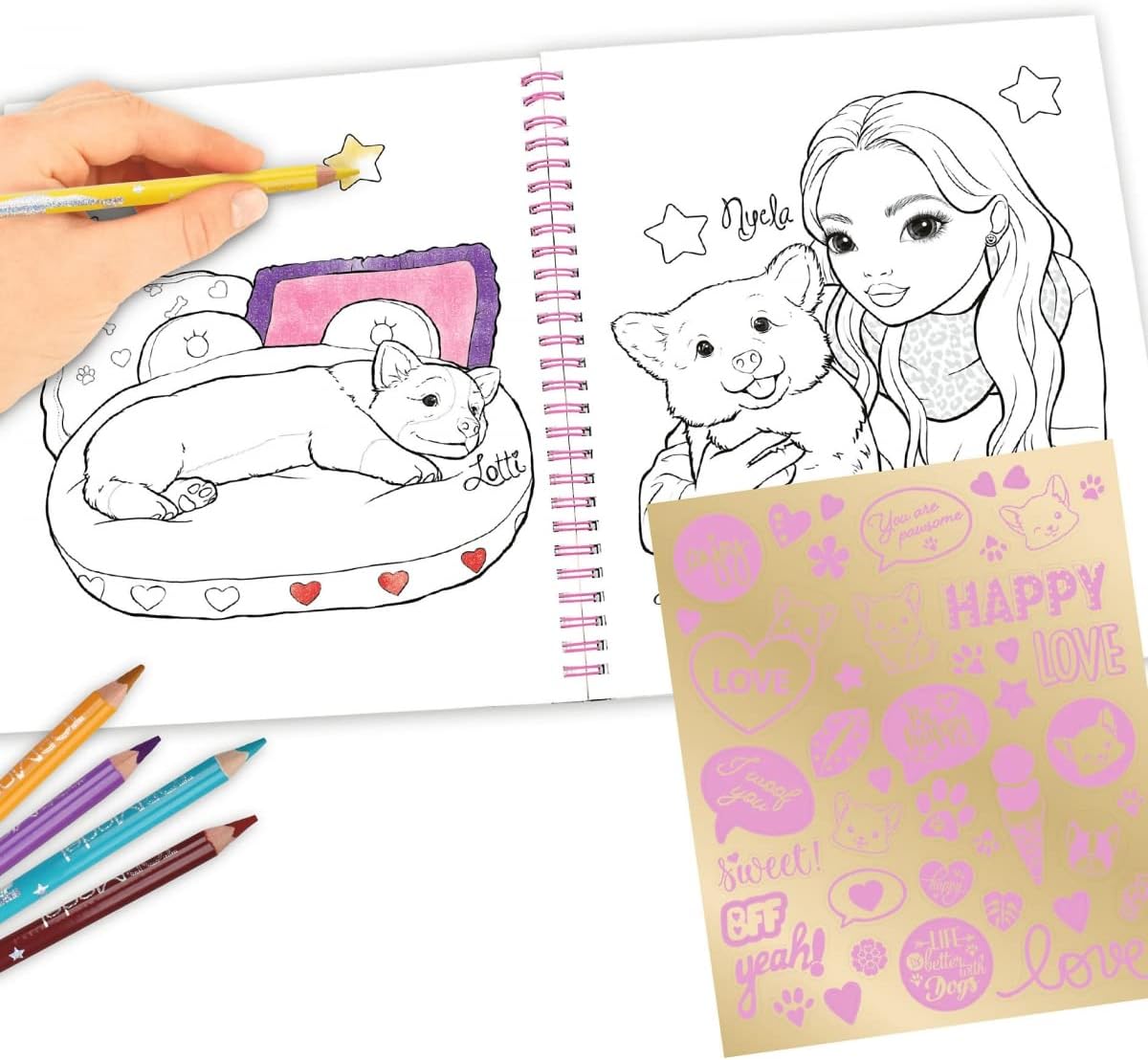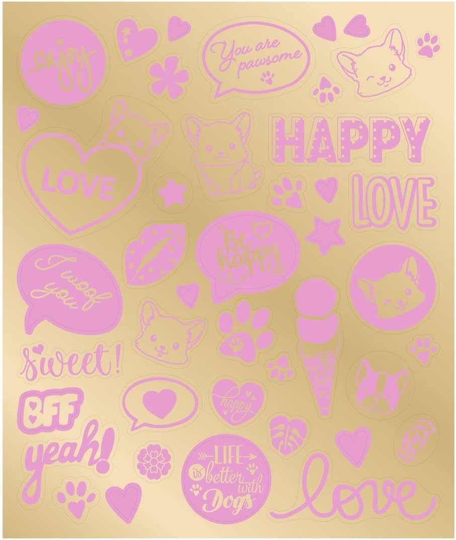 • Kreatywna książka wraz z arkuszem naklejek z uroczymi naklejkami w kolorze złotym i różowym