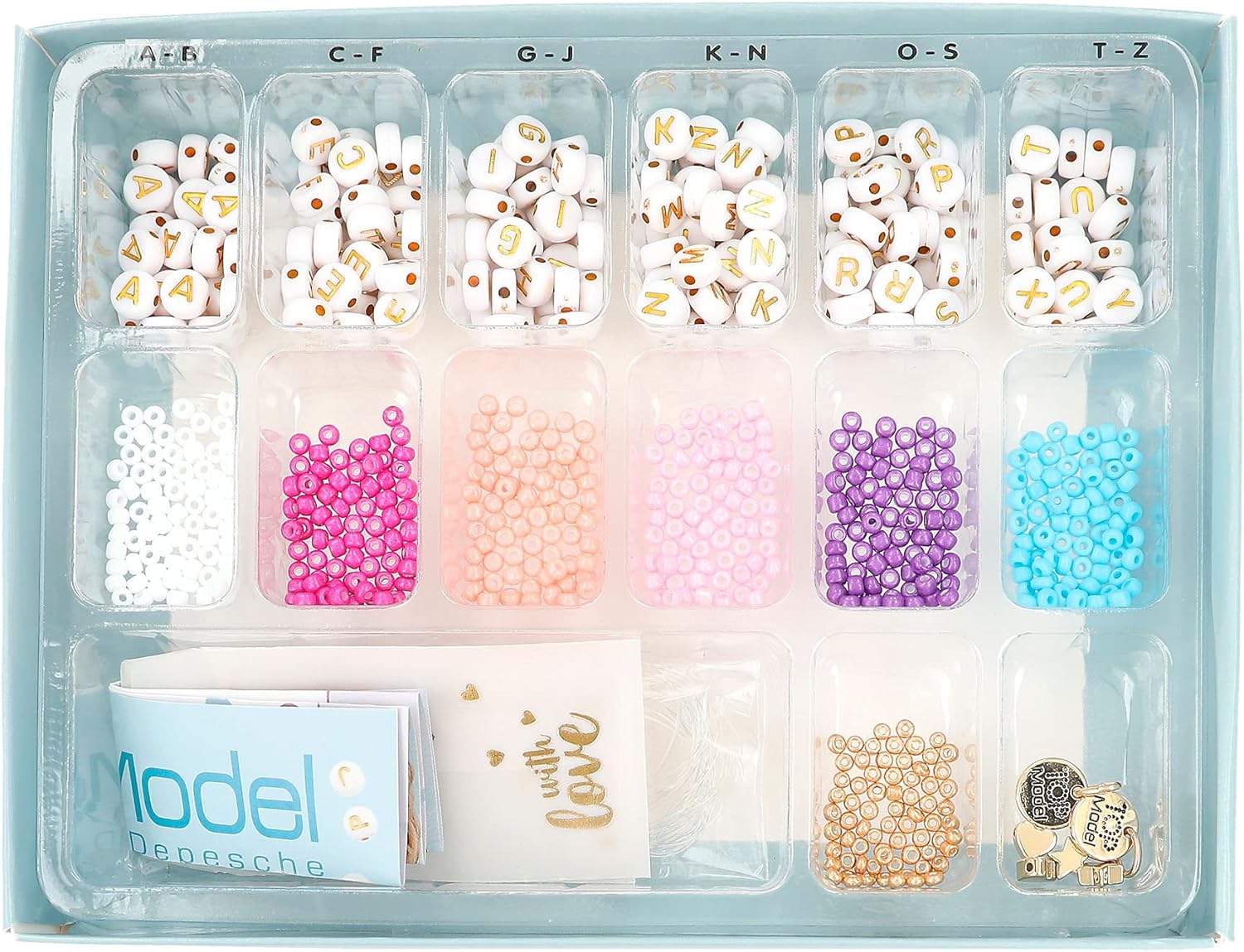 W zestawie znajduje się 490 małych koralików w kolorach białym, różowym, morelowym, różowym, fioletowym, turkusowym i złotym oraz 207 koralików z literami, 6 złotych metalowych zawieszek i 3 małe torebki na prezenty