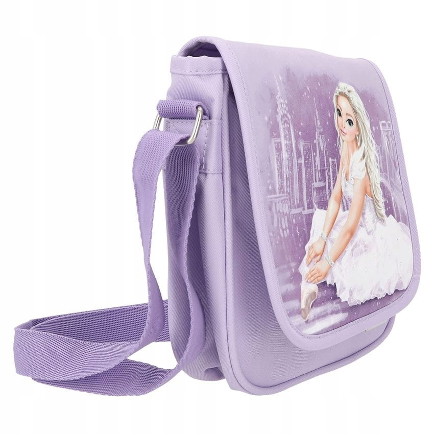 Mała fioletowa torebka na ramię z fantastycznie piękną baleriną TOPModel na przodzie ma ozdobne kryształki w motywie jako szlachetne detale. Klapa zamykana na magnes, pasek na ramię ma regulowaną długość, a komora główna ma dodatkową kieszeń wewnętrzną. Materiał: 100 procent poliestru