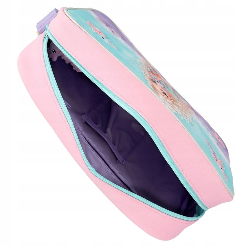 Podwodny sen: duża torba na ramię TOPModel we wspaniałych odcieniach turkusu, fioletu i różu ma piękny motyw syreny z brokatowymi detalami i uroczymi aksolotlami dookoła. W obszernej komorze głównej znajduje się oddzielna kieszeń wewnętrzna zapinana na suwak. Pasek na ramię ma regulowaną długość.