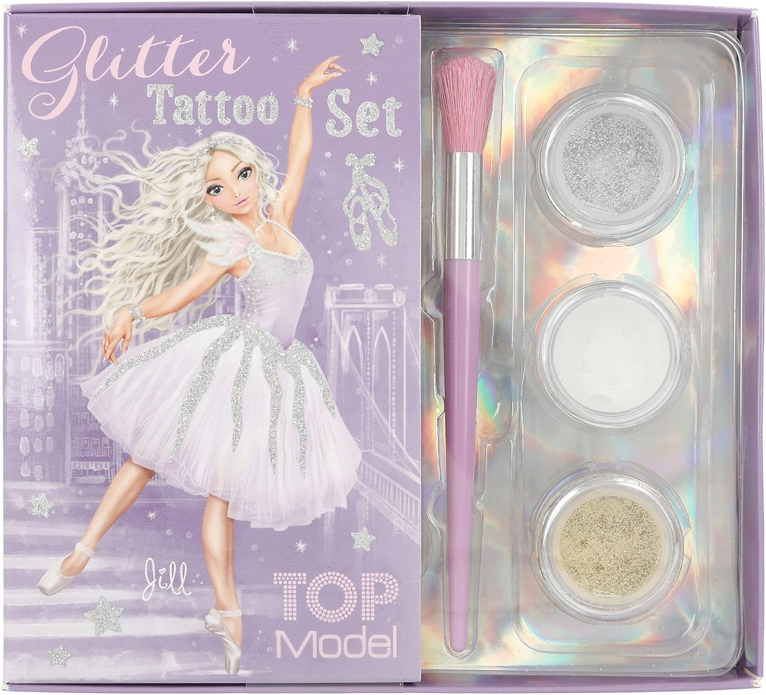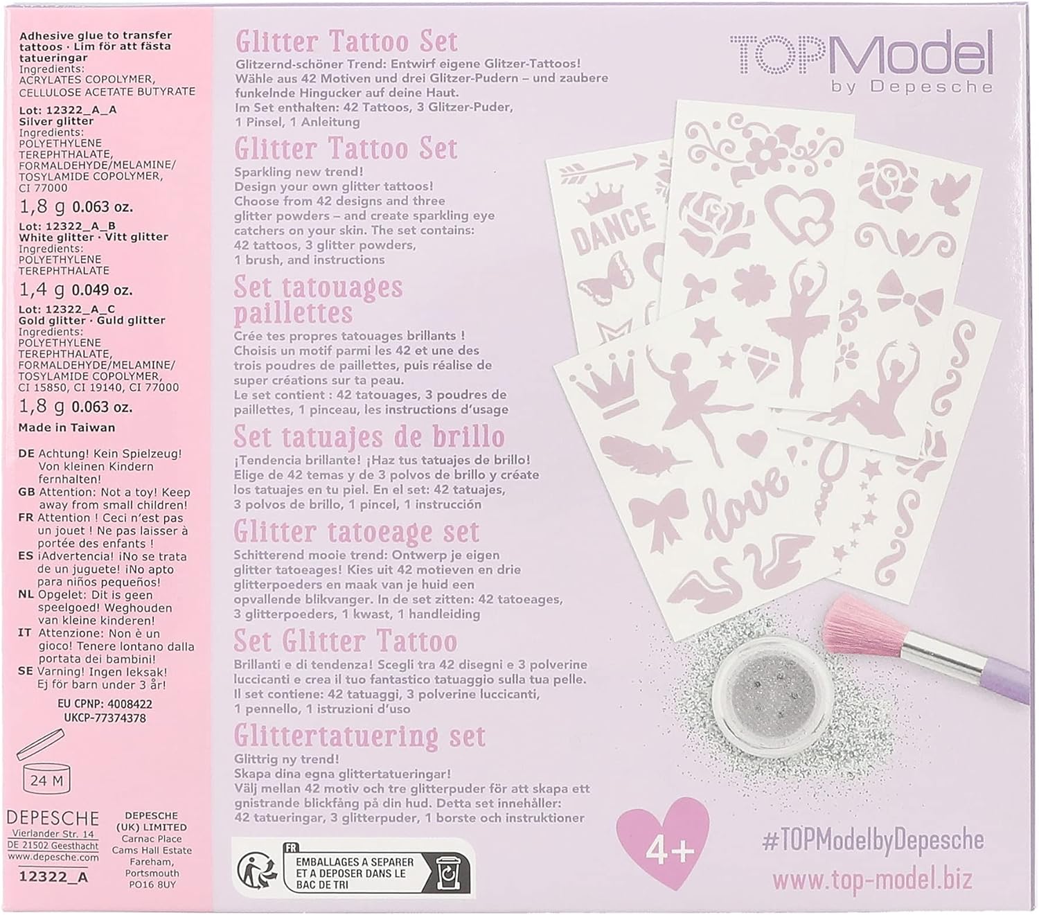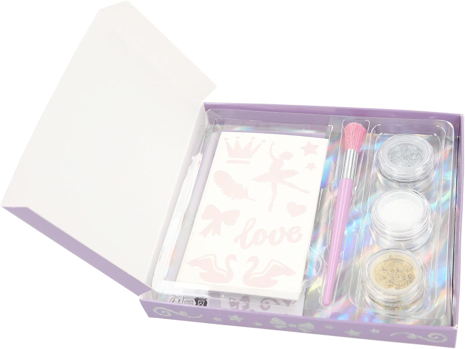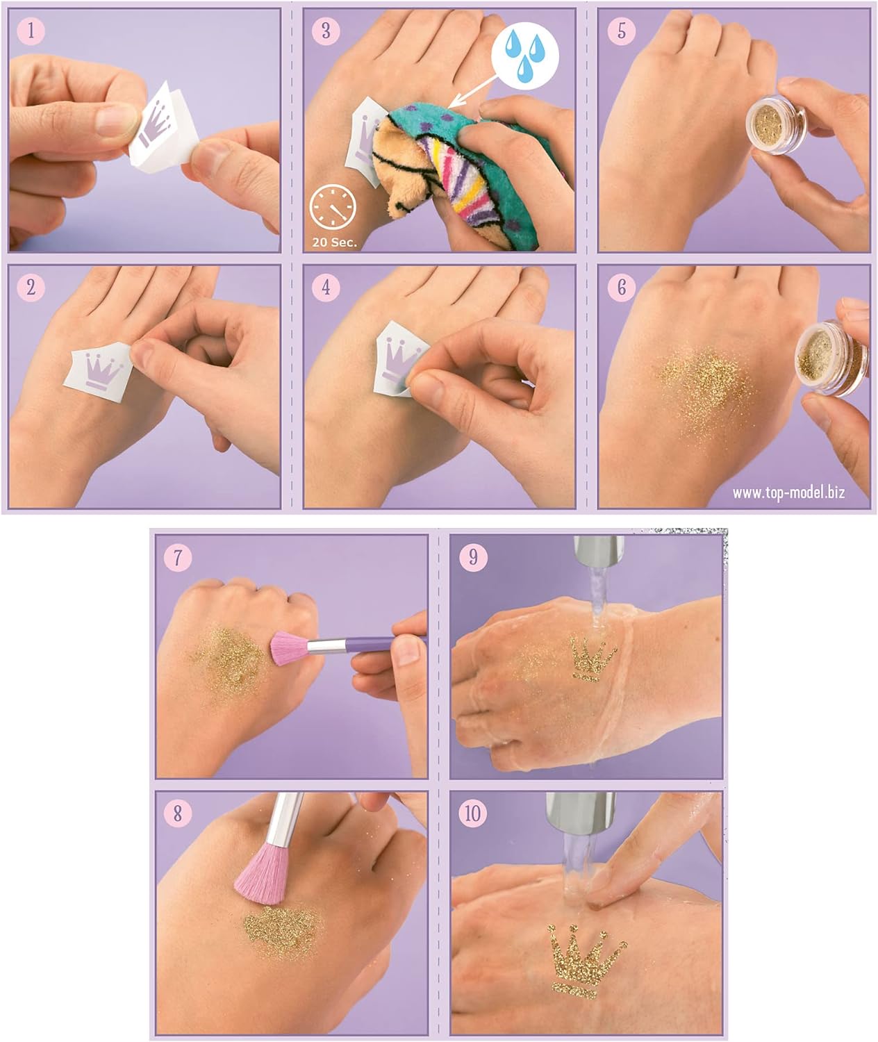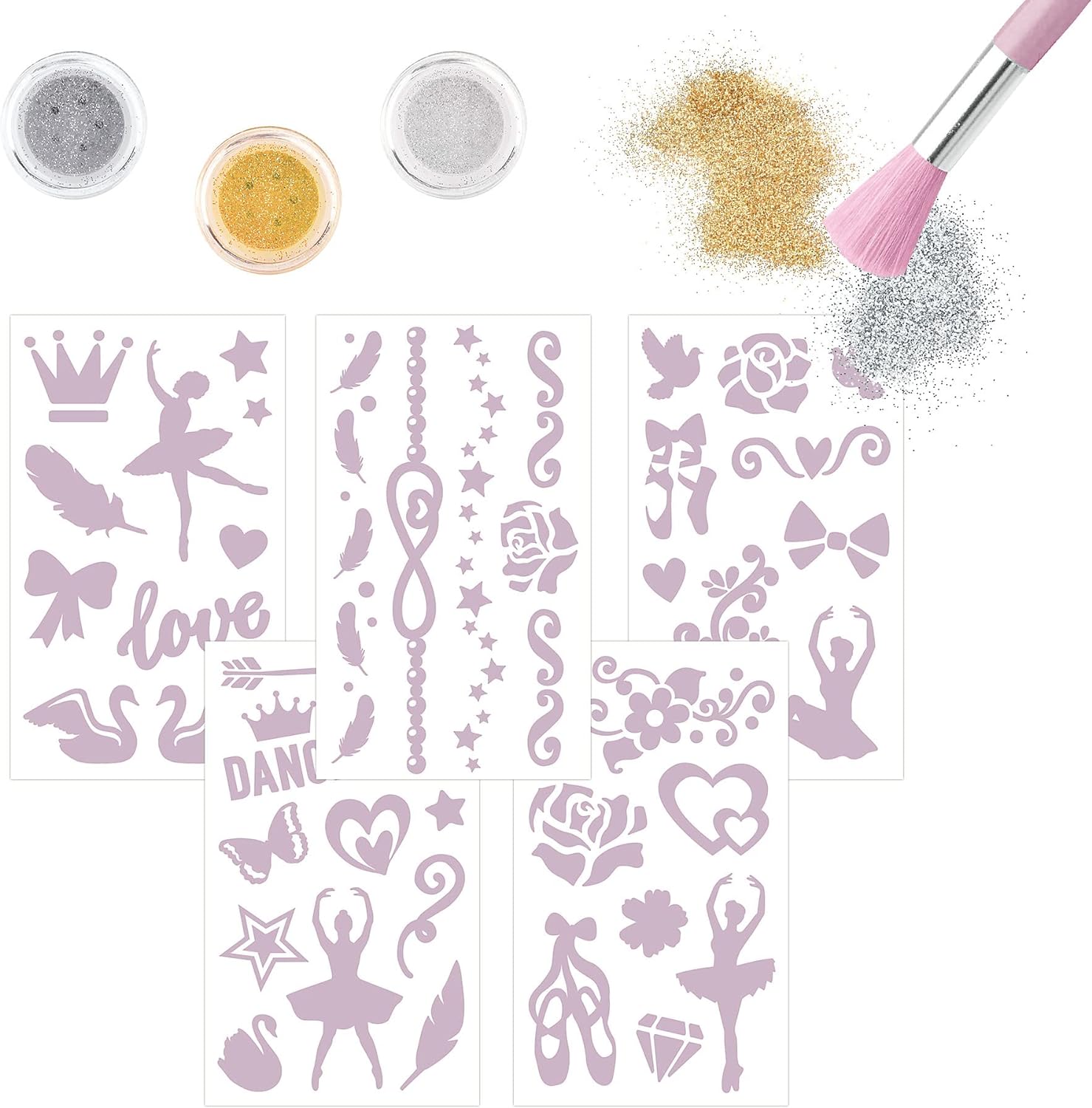 • W zestawie znajdują się 42 samoprzylepne szablony do tatuażu, różne brokatowe pudry w kolorze srebrnym, białym i złotym oraz pędzel