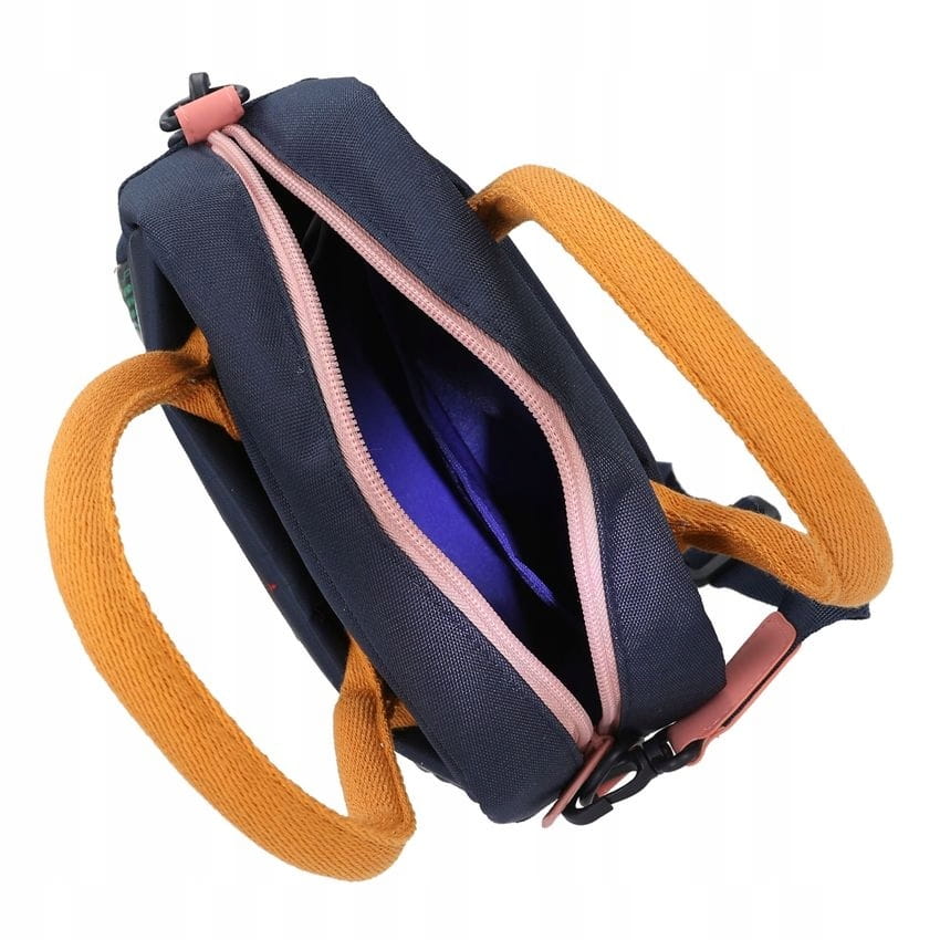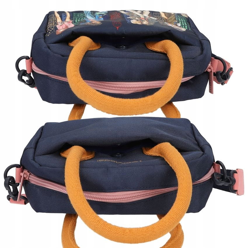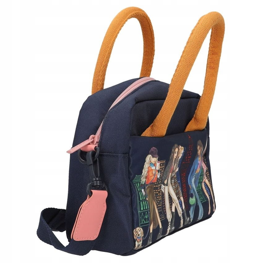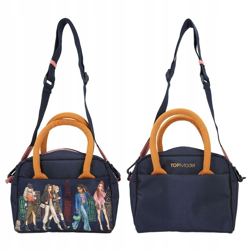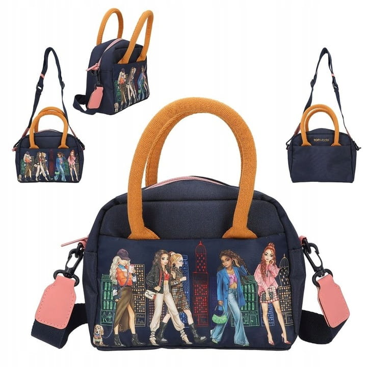 Fajny miejski styl: mała, ciemnoniebieska torba na ramię TOPModel z regulowanym, odpinanym paskiem na ramię i kontrastowymi uchwytami w kolorze złotym i żółtym ma z przodu duży motyw modelu w jasnych kolorach przed kolorowo ilustrowaną panoramą. Wewnątrz torby znajduje się osobna dodatkowa komora. Warto wiedzieć i zobaczyć: elementy odblaskowe na pasku na ramię.