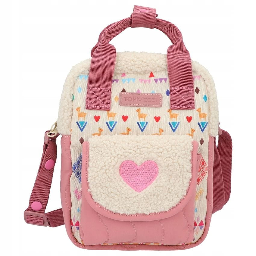 Przytulnie: mała torebka TOPModel w delikatnym starym różu z modnym pikowaniem ma puszyste detale ze sztucznego pluszowego futerka, przód w kolorowe wzory, uroczą naszywkę w kształcie serca, a także dwa uchwyty do noszenia i pasek na ramię o regulowanej długości. Kieszeń przednia zamykana jest na zatrzask, komora główna (posiadająca wiele przegródek wewnętrznych) posiada zamek błyskawiczny.