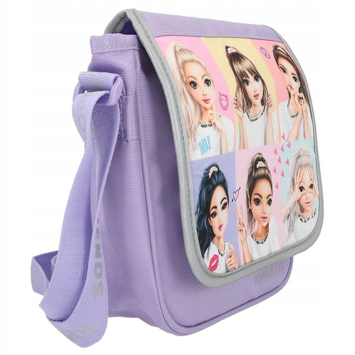 Fajne zdjęcia z TOPModels: Mała torba na ramię TOPModel Snap Shots ma z przodu kolorowe motywy modelek i mnóstwo wesołego fioletu. Zapinana na magnes, kieszeń wewnętrzna i pasek na ramię z nadrukowanym odblaskowym napisem i możliwością regulacji długości.