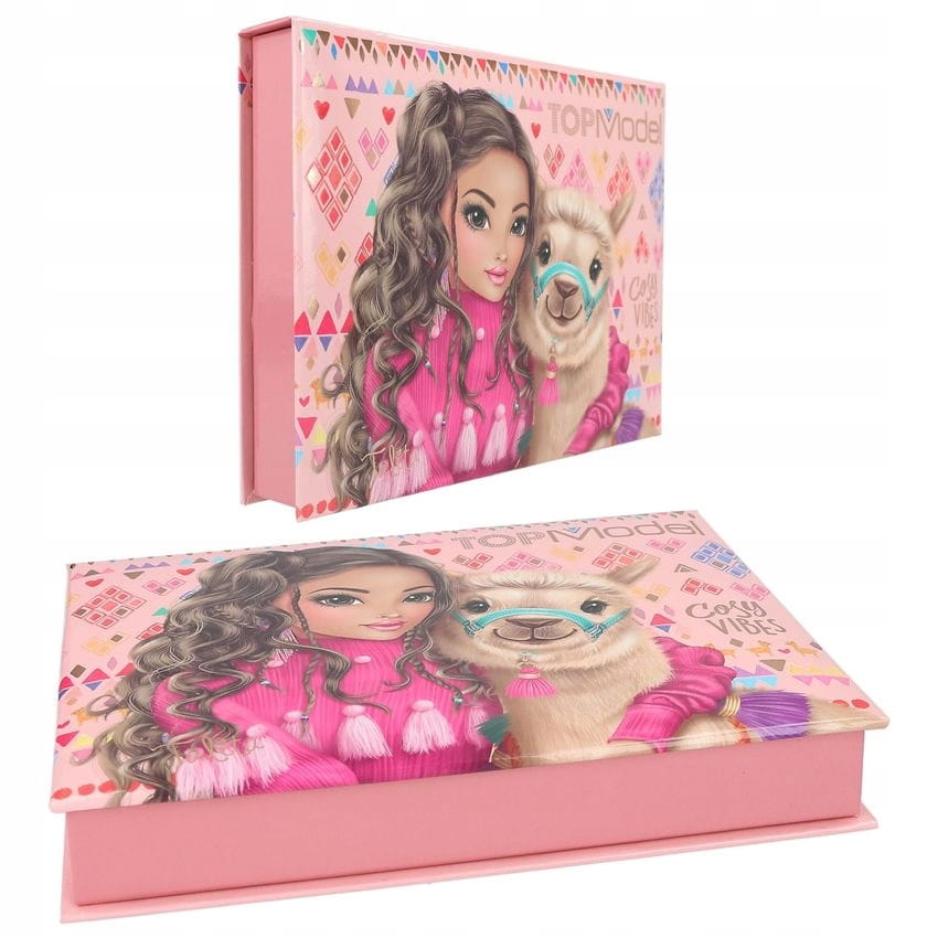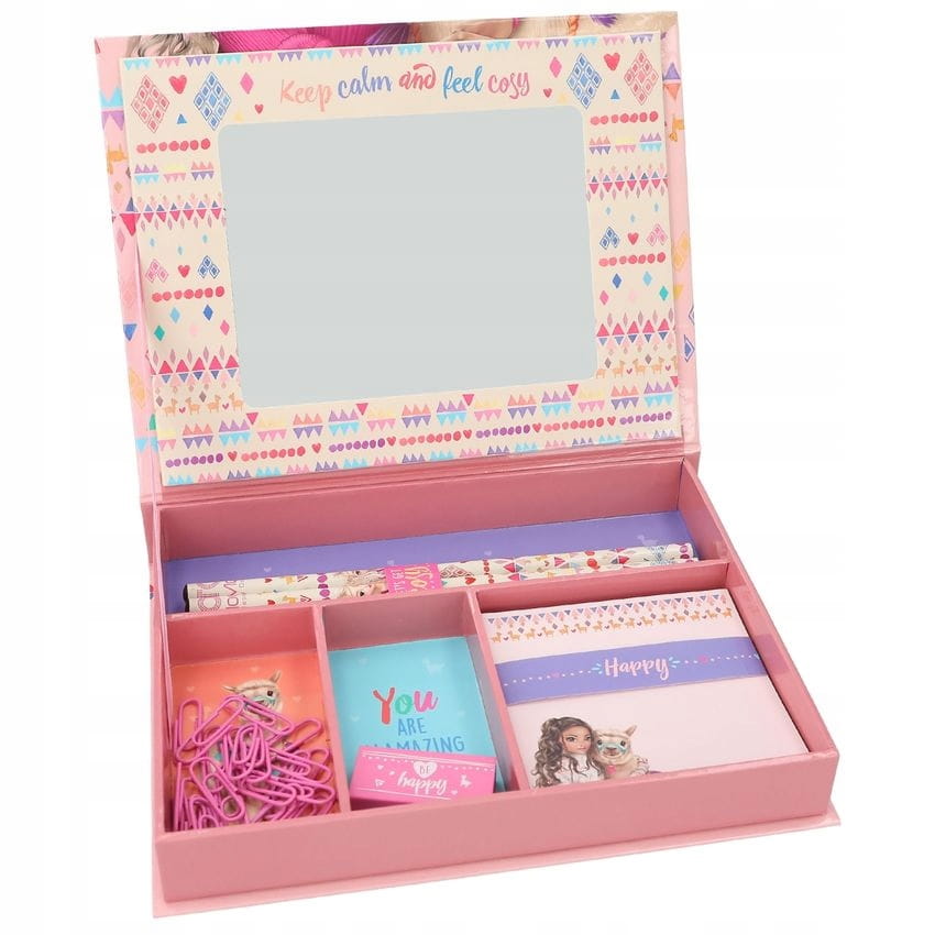 Wszystko na biurko: Pudełko na artykuły papiernicze TOPModel zawiera 3 kolorowe ołówki z uroczymi wzorami, 1 gumkę z nadrukiem oraz 25 różowych spinaczy i 100 różowych notatek. Samo pudełko posiada świetny modelowy motyw lamy na zewnętrznej stronie uchylnego wieczka na tle kolorowych wzorów. Wewnątrz uchylnej pokrywy znajduje się lusterko.