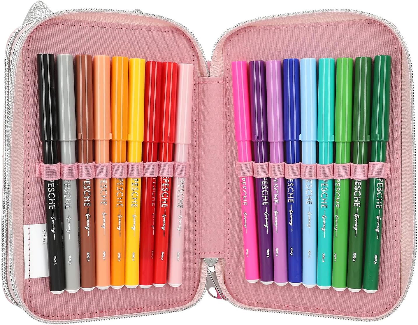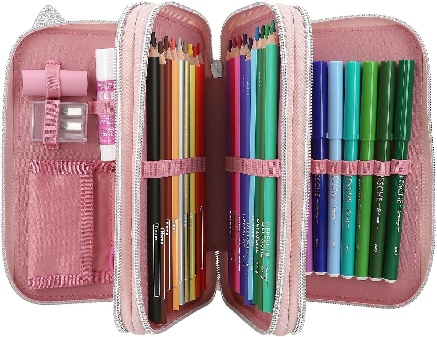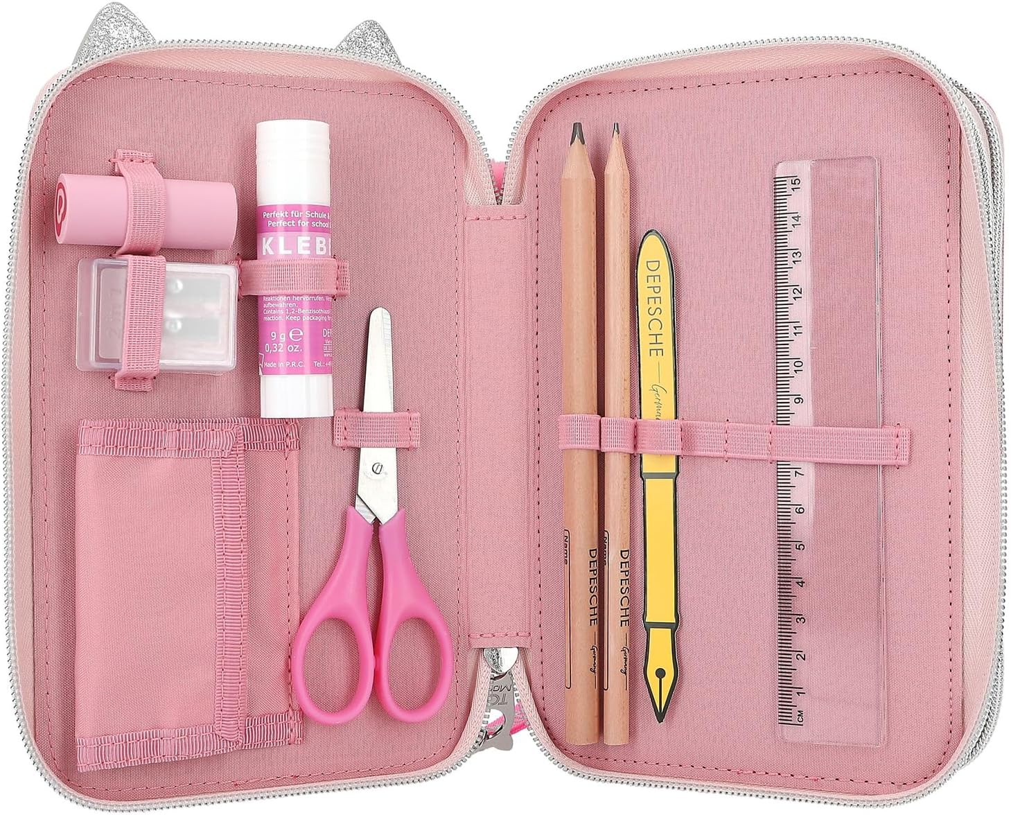 • Wypełniony 18 kolorowymi pisakami i flamastrami, 2 ołówkami, gumką, temperówką, linijką, nożyczkami, klejem w sztyfcie i małą torebką na rzep