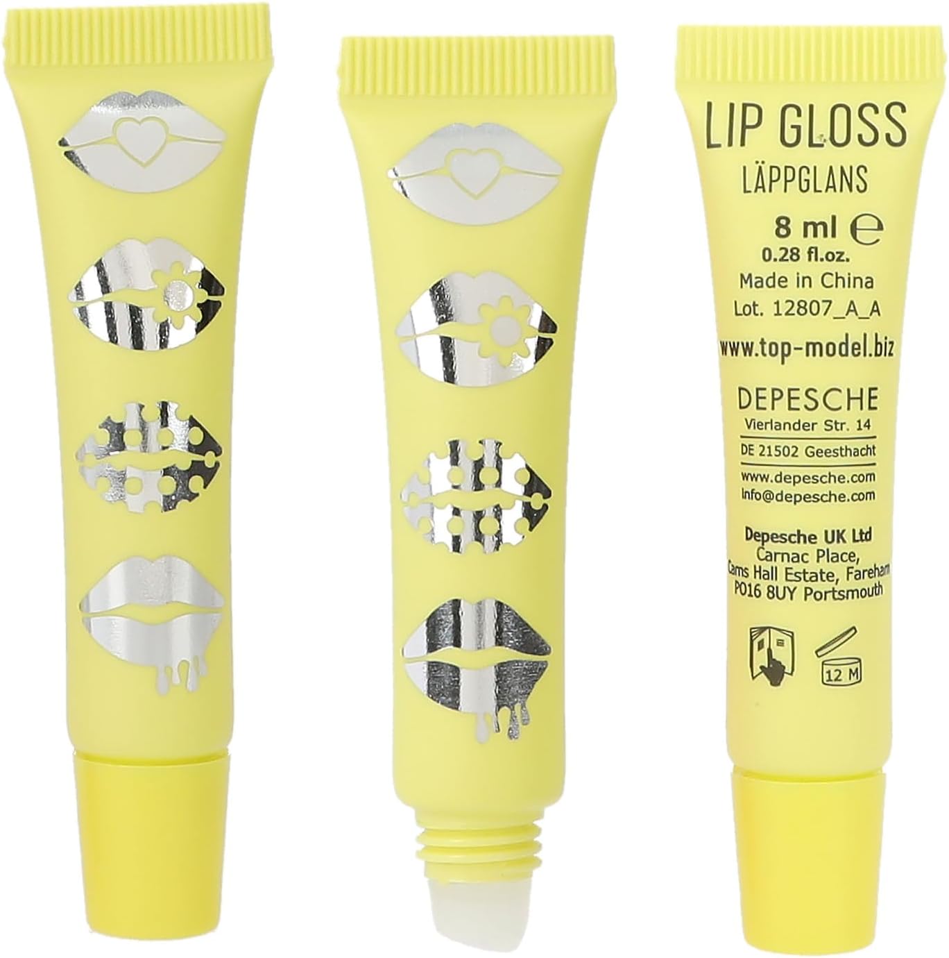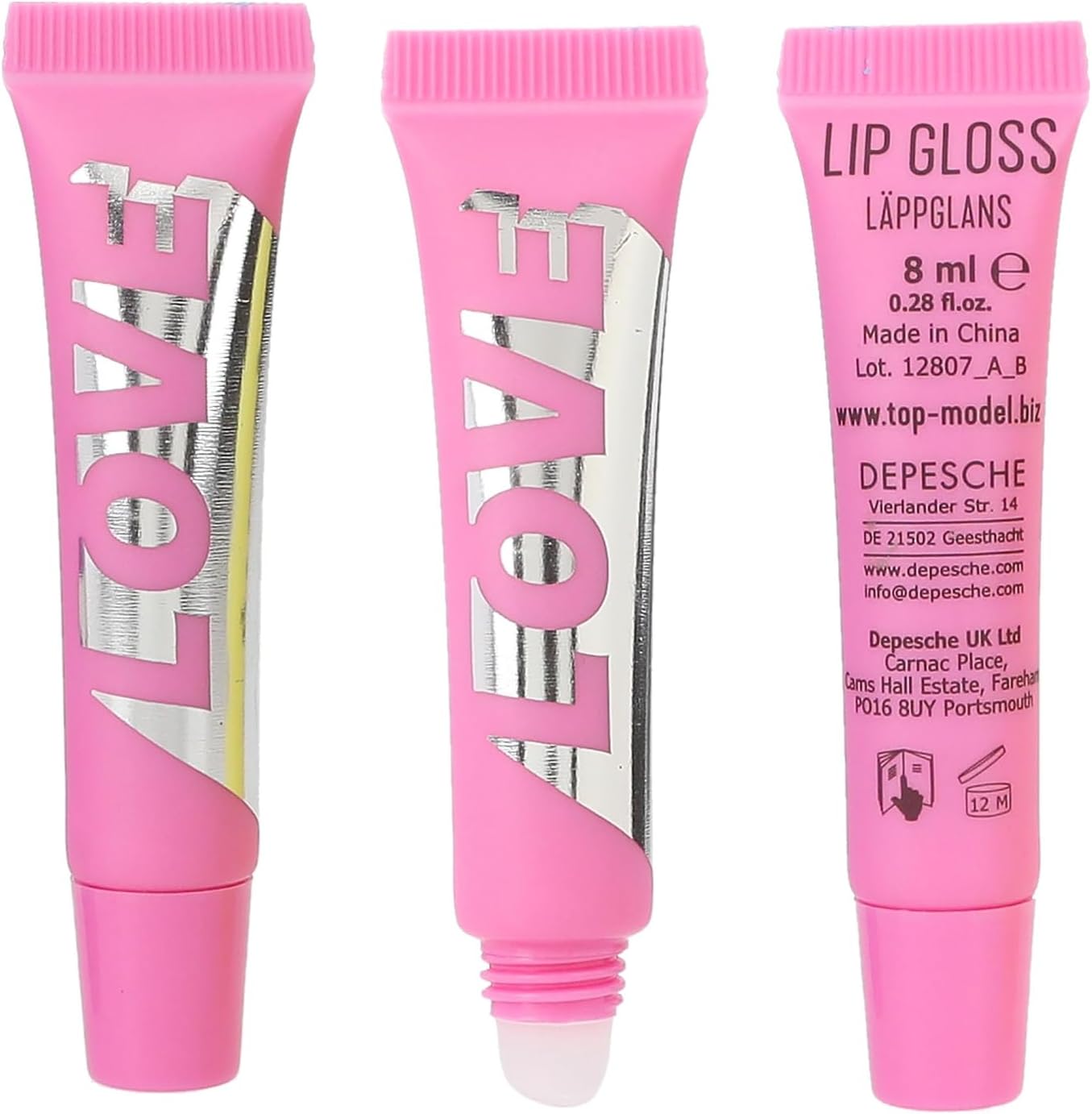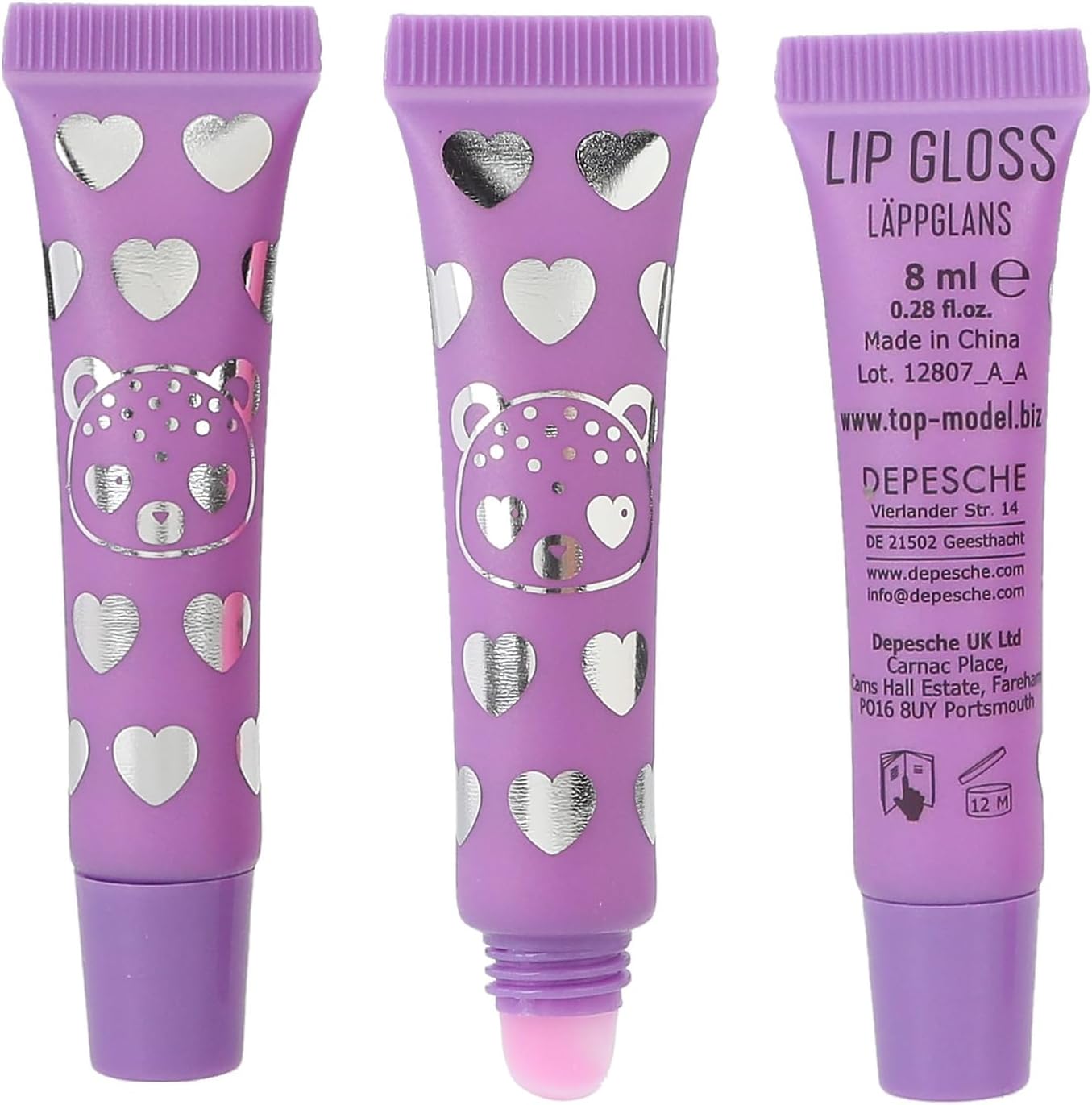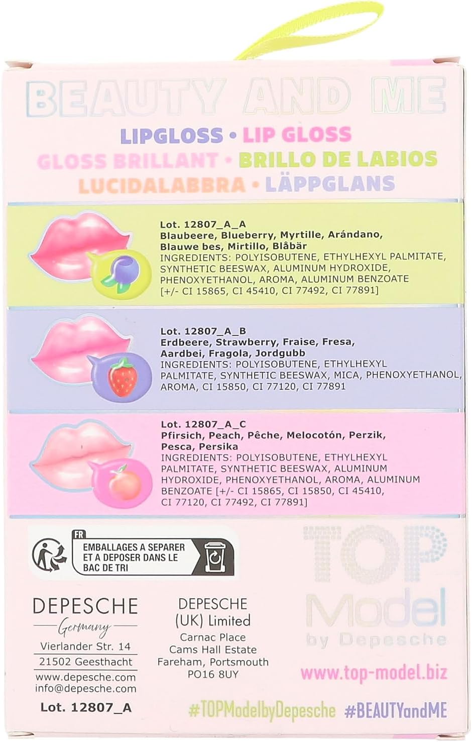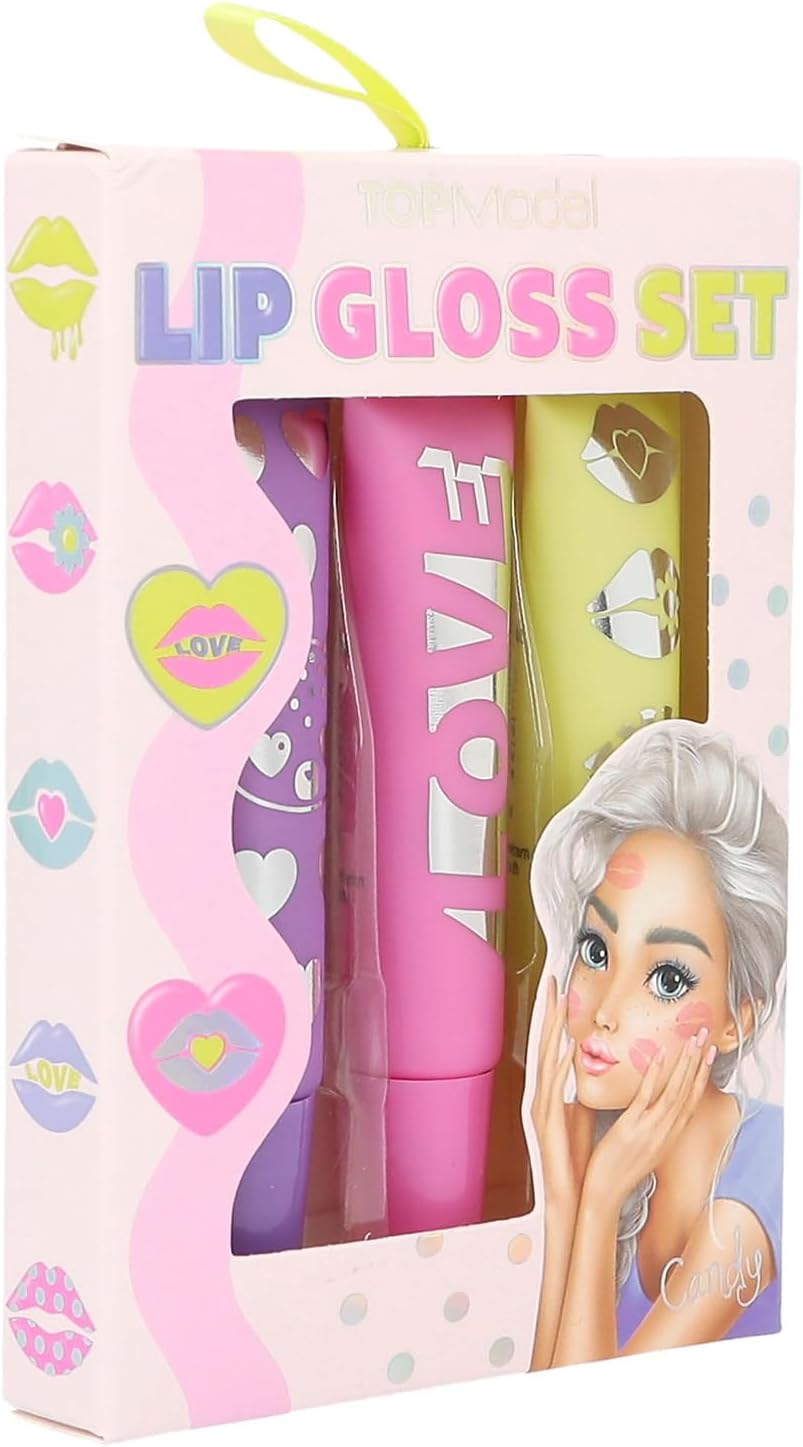 W zestawie znajdują się 3 błyszczyki do ust (po 8 ml) w różnych odcieniach różu i zapachach jagody, truskawki i brzoskwini