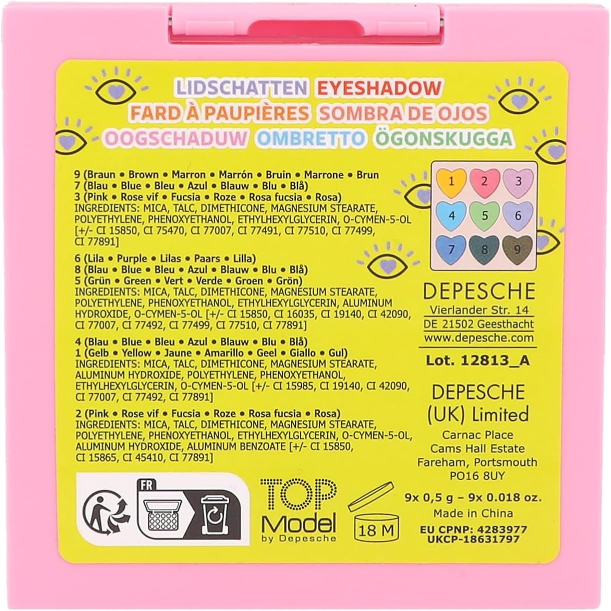 • Zawiera 0,5 g cieni do powiek w kolorze żółtym, różowym, różowym, jasnoniebieskim, jasnozielonym, fioletowym, ciemnoniebieskim, brązowym i niebieskim