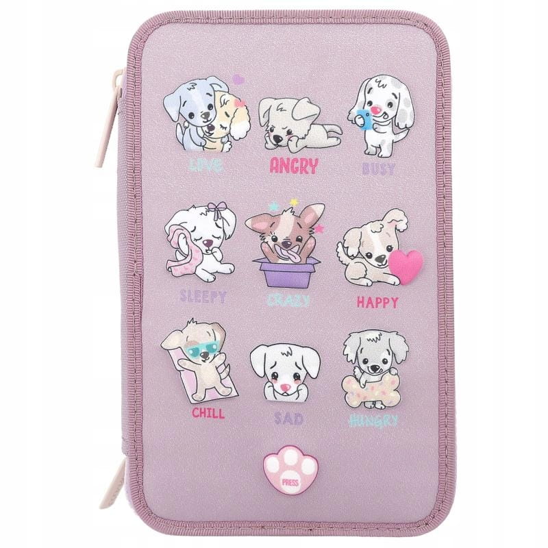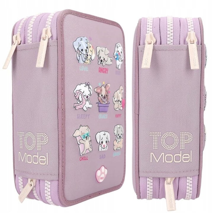 Zmęczony, szczęśliwy, zrelaksowany, milutki? Jaki jest nastrój? Urocze pieski na piórniku TOPModel w kolorze przydymionego fioletu zdradzają wszystko: po naciśnięciu przycisku LED lampka szybko przemieszcza się od jednego pieska do drugiego, a następnie po około 7 sekundach losowo zatrzymuje się na jednym. Trzy oddzielne przegródki piórnika są całkowicie wypełnione 18 kolorowymi kredkami i pisakami, 2 ołówkami, temperówką, gumką, linijką, nożyczkami, klejem w sztyfcie i małą torebką na rzep. Materiał: 100 procent poliestru