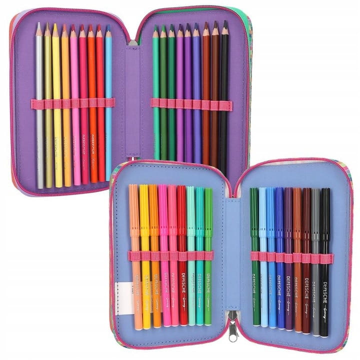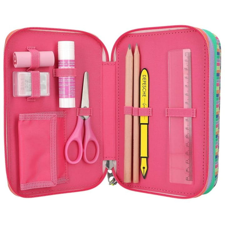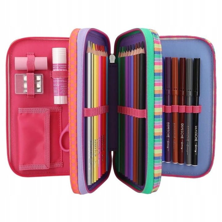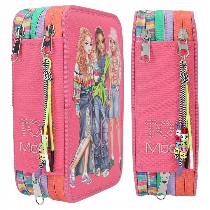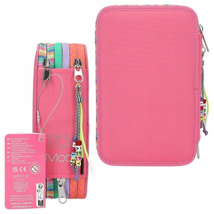 Kolor sprawia radość: różowy piórnik TOPModel JOY ma duży motyw z przodu z trzema modelami, paski zamka z różnymi wzorami i super fajny uchwyt zamka wykonany z tasiemek biodrowych i koralików z literami (HAPPY GIRLS). Trzy oddzielne przegródki są całkowicie wypełnione 18 kolorowymi ołówkami i pisakami, 2 ołówkami, temperówką, gumką, linijką, nożyczkami, klejem w sztyfcie i małą torebką. Materiał: 100% PES