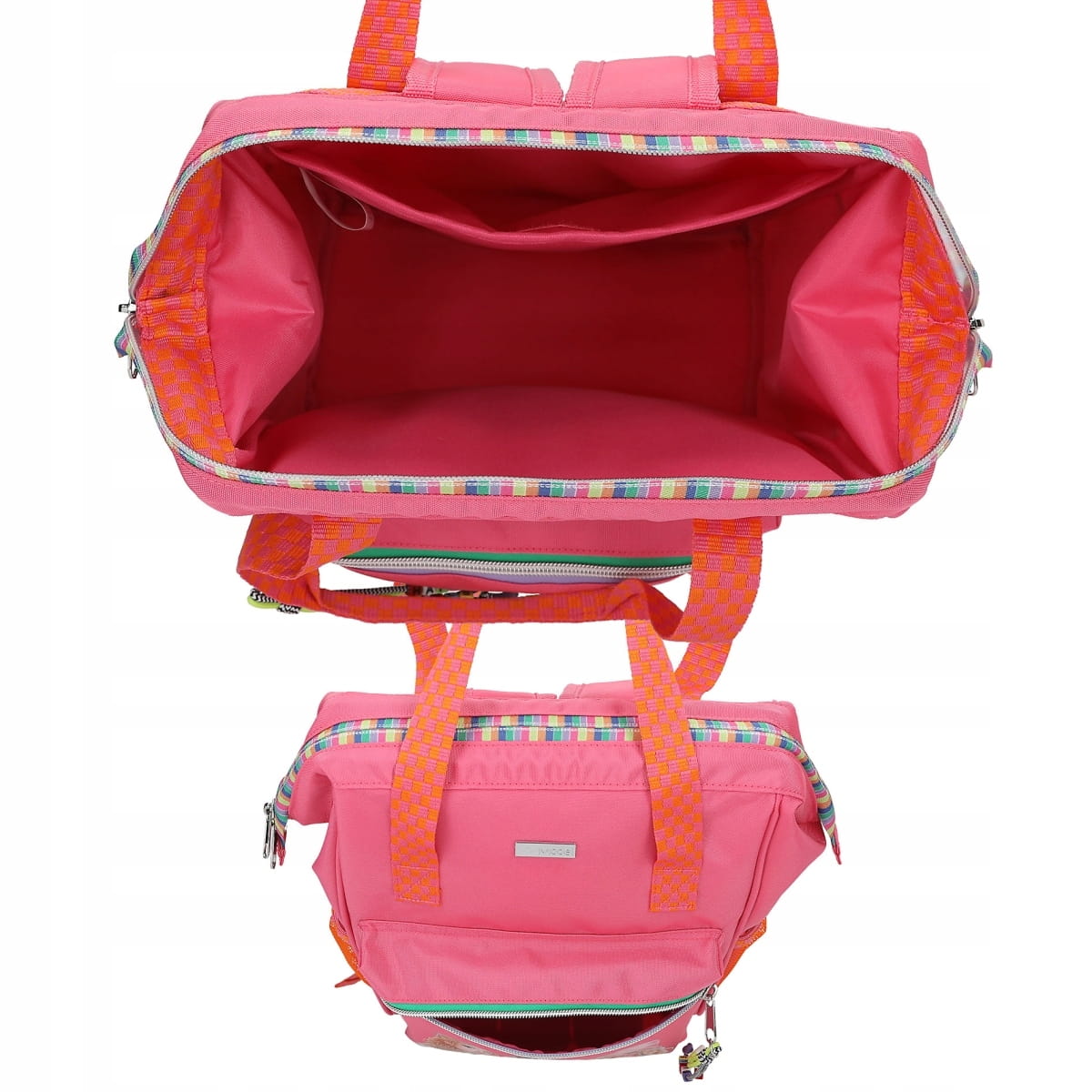 Kolor sprawia radość: różowy plecak TOPModel JOY ma wspaniały motyw z trzema modelami na przedniej kieszeni, kolorowe, wzorzyste paski zamka błyskawicznego, pomarańczowe kieszenie z siateczki po bokach, regulowane, wyściełane szelki, dwa uchwyty do noszenia i super fajny zamek błyskawiczny wykonany z kolorowe wstążki i koraliki z literami (HAPPY GIRLS). Po otwarciu torba zapewnia dobry przegląd wnętrza dzięki zintegrowanemu zapięciu na pałąk. Praktyczne: wyściełana komora wewnętrzna zapewnia bezpieczny transport, np. tabletu.