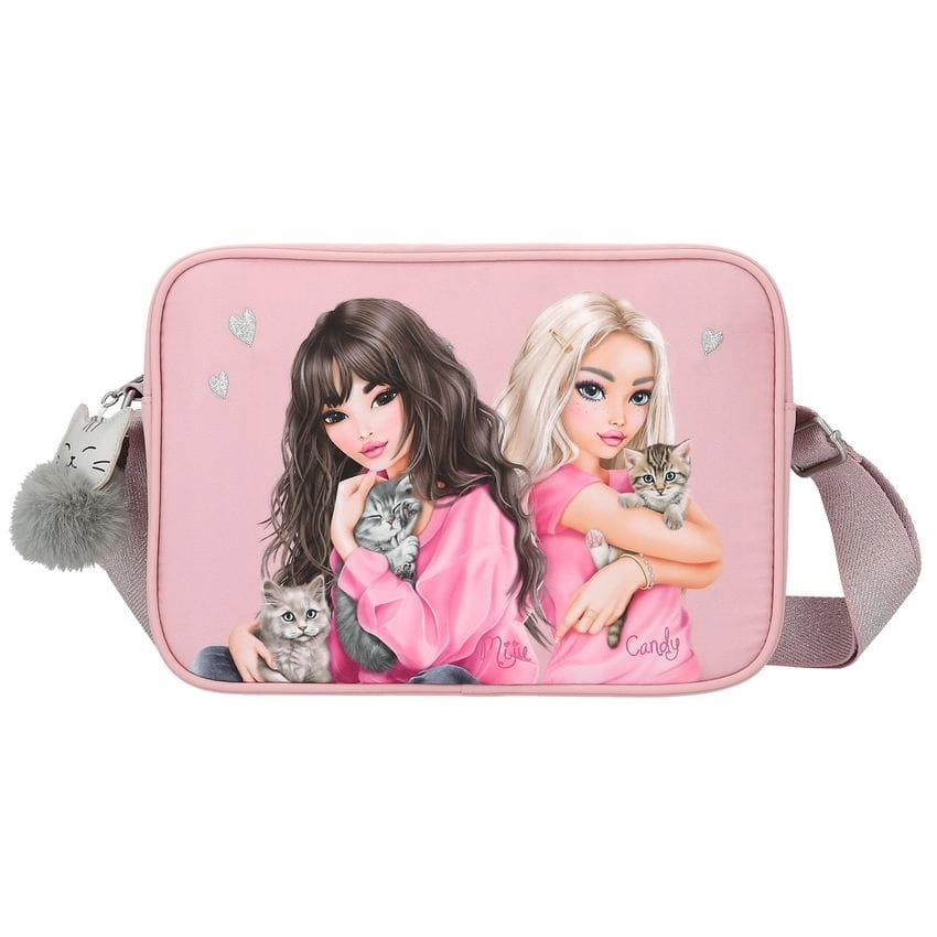 Miau-wow! Różowa torba na ramię TOPModel ma z przodu duży motyw modelki z trzema uroczymi kotkami i srebrnym haftem w kształcie serca. Słodki plus: zawieszka z kotem na zamku błyskawicznym, wykonana z puszystego sztucznego futerka. Delikatnie połyskujący pasek ma regulowaną długość, a obszerna komora główna posiada osobną wsuwaną kieszeń oraz dodatkową kieszeń wewnętrzną zapinaną na zamek.