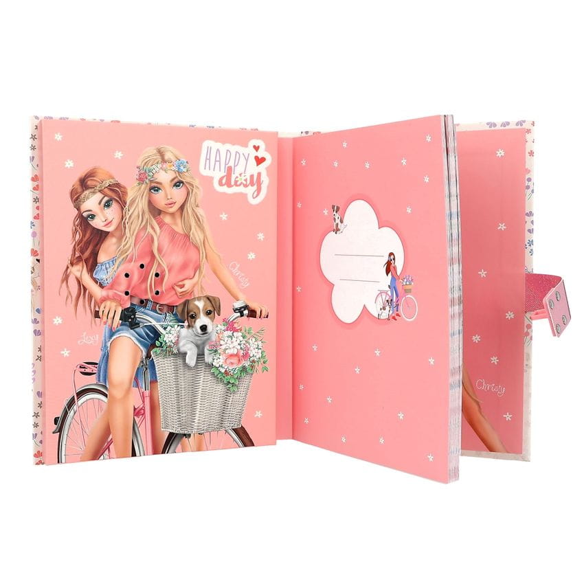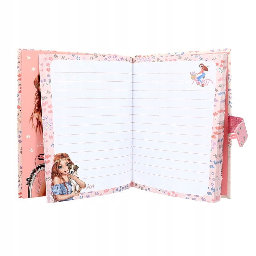 Do przemyśleń i tajemnic: Pamiętnik TOPModel otwiera się tylko wtedy, gdy zostanie wprowadzony poprawny kod (4 cyfry, można ustawić/zmienić osobiście). Następnie przez około 20 sekund odtwarzany jest najwyższy hit „I’m Good”. Wewnątrz pamiętnik znajduje się 80 pięknie ilustrowanych stron w linie. Na zewnątrz delikatny, kwiatowy wzór na całej powierzchni, urocze pieski i rowerkowe dziewczynki oraz duży motyw modelki.