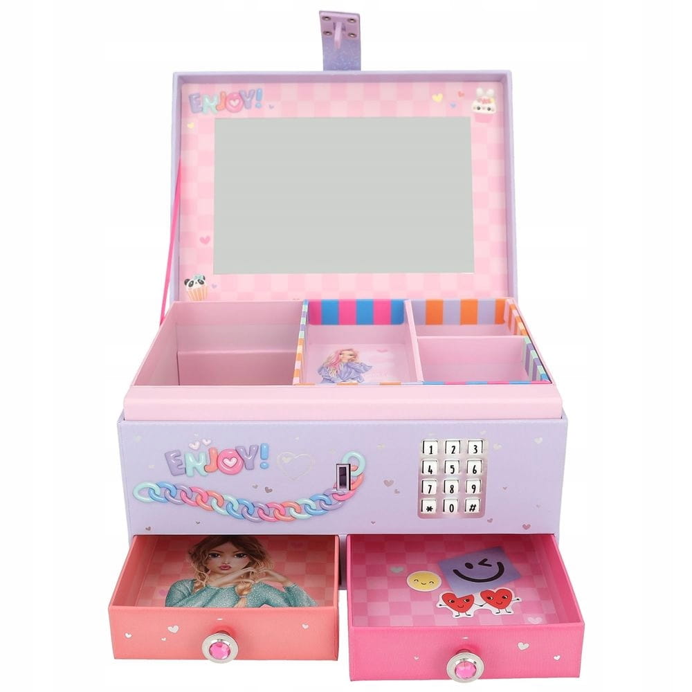 Na małe skarby i tajemnice: Pudełko na biżuterię TOPModel otwiera się dopiero po wprowadzeniu prawidłowego czterocyfrowego kodu (osobiście ustawianego i zmiennego). Następnie przez około 20 sekund odtwarzany jest największy hit Shivers. Obudowa w ładnym, jasnofioletowym kolorze ze wspaniałymi nadrukami modnych łańcuszków i zawieszek oraz stylowym motywem podwójnego modelu na wieczku. Wewnątrz szkatułka na biżuterię posiada lusterko, wyjmowaną wkładkę z trzema przegródkami oraz dwie szuflady z kamieniami szlachetnymi na guziku uchwytu.