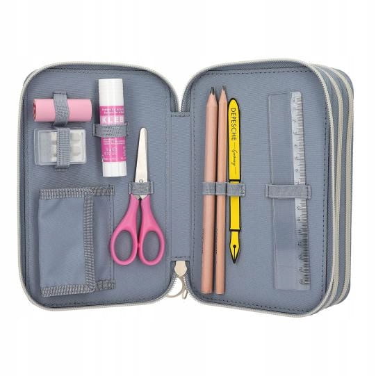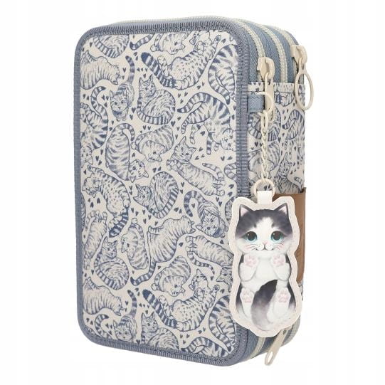 Cat Love: Jasnoniebieski i kremowy piórnik marki TOPModel ma duży motyw z trzema kociakami z przodu i uroczy wzór kota na całej powierzchni. Uroczy bonus: zawieszka w kształcie kota, którą można umieścić w małej kieszonce z boku. Każda z trzech oddzielnych przegródek jest wypełniona 18 kolorowankami i pisakami, 2 ołówkami, temperówką, gumką, linijką, nożyczkami, klejem w sztyfcie i małą kieszonką zapinaną na rzep. Materiał: 100% poliester
