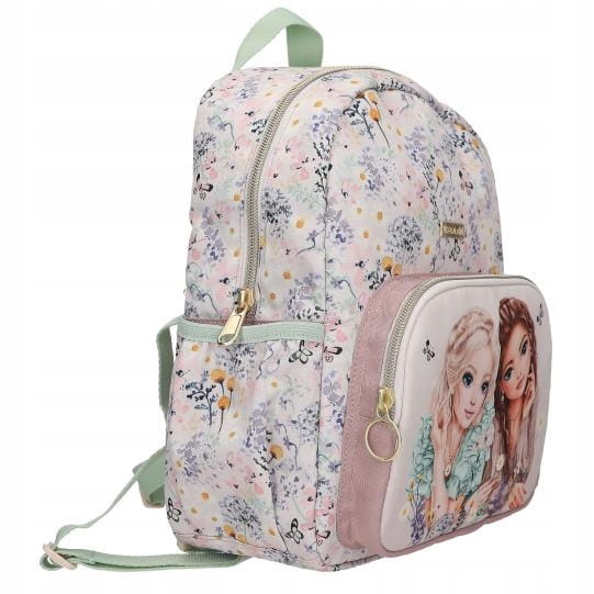 • mały plecak w odcieniach różu i modnej zieleni szałwiowej, dookoła delikatny wzór kwiatów i motyli