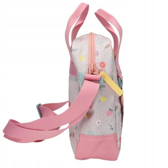 Torba na ramię TOP MODEL Juicy ma duży, podwójny motyw z małpką z przodu i wesoły nadruk z kropkami, kwiatami, owocami, małpkami, ptakami, palmami i letnimi dodatkami dookoła. Uchwyty, regulowany pasek i zamek błyskawiczny są różowe. Zamek błyskawiczny ma żółty, tekstylny uchwyt. Wewnętrzna przegroda oferuje dodatkową kieszeń. Super: Uchwyt ma kółko do przyczepienia np. zawieszek. Materiał: 100% poliester