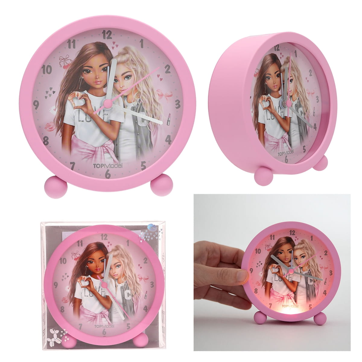 Czas na TOPModel! Okrągły, różowy budzik z tworzywa sztucznego z efektownym podwójnym motywem i uroczymi, dziewczęcymi ikonami na tarczy. Stoi na kulistych nóżkach i pracuje absolutnie bezgłośnie. Z funkcją alarmu i oświetlenia (za naciśnięciem przycisku). Średnica: ok. 11 cm; bateria (1 x AA 1,5 V) w zestawie i wymienna.