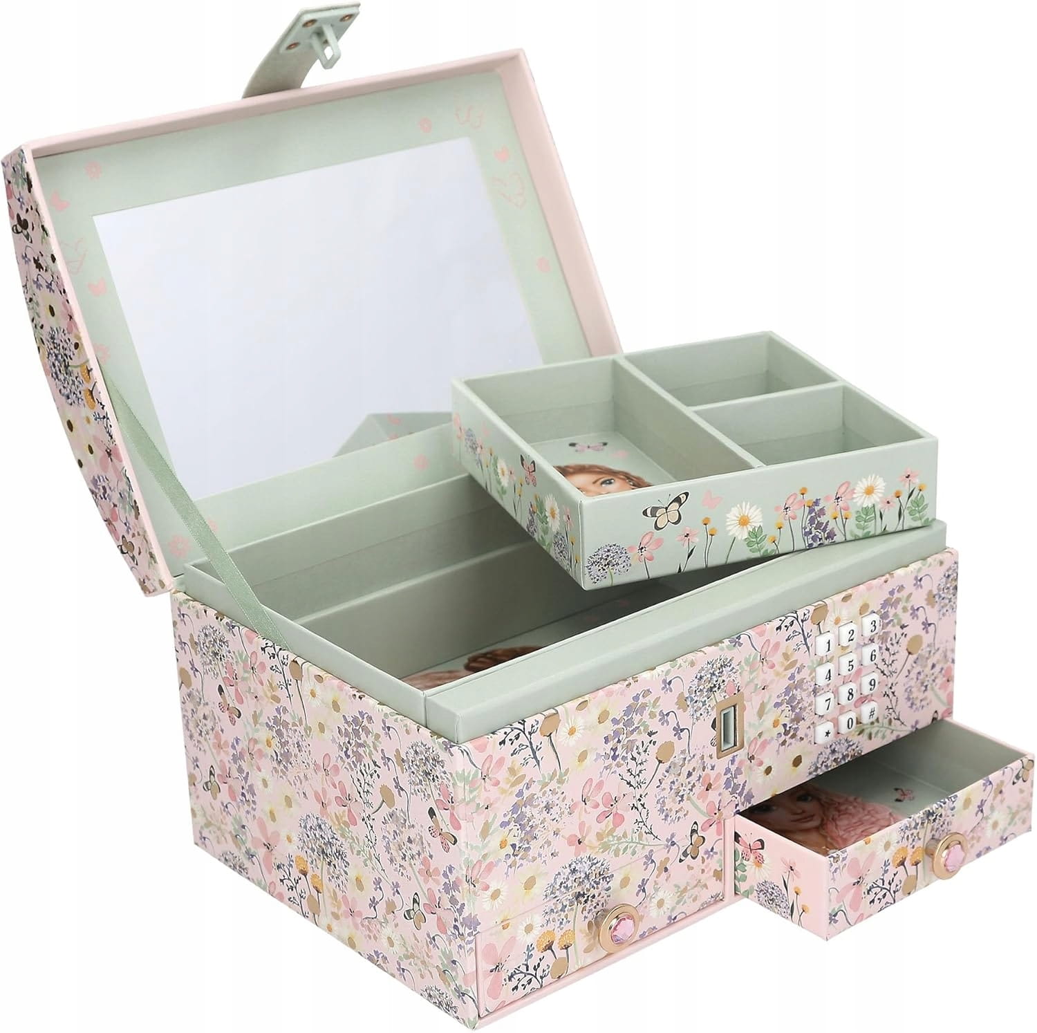 Na małe skarby i sekrety: Różowe pudełeczko na biżuterię od TOPModel otwiera się tylko po wprowadzeniu prawidłowego kodu (można go spersonalizować i zmienić). Najpopularniejszy hit Shivers grany jest przez ok. 20 sekund. Wewnątrz szkatułki znajduje się wyjmowana wkładka z trzema przegródkami i lusterkiem. Na zewnątrz znajdują się dwie kolejne szufladki z ozdobnym guzikiem w kształcie kamienia jubilerskiego. Motyw kwiatowy można odnaleźć wszędzie, zarówno wewnątrz, jak i na zewnątrz: w postaci dużego, podwójnego motywu na zawiasowej pokrywie oraz mnóstwa delikatnych motyli.
