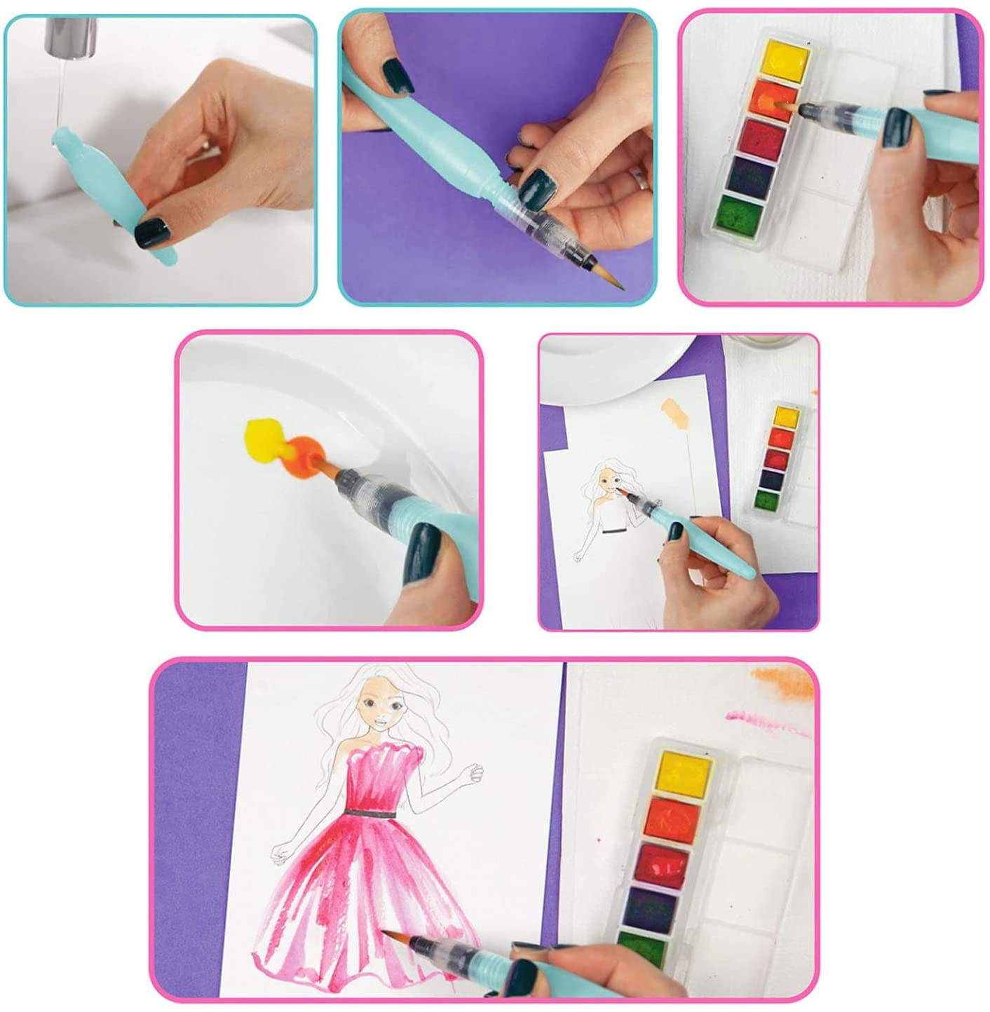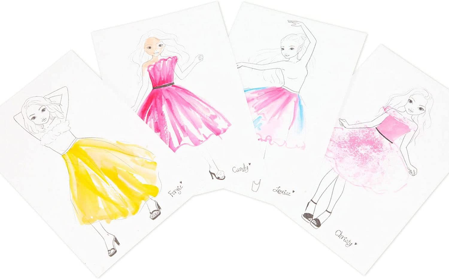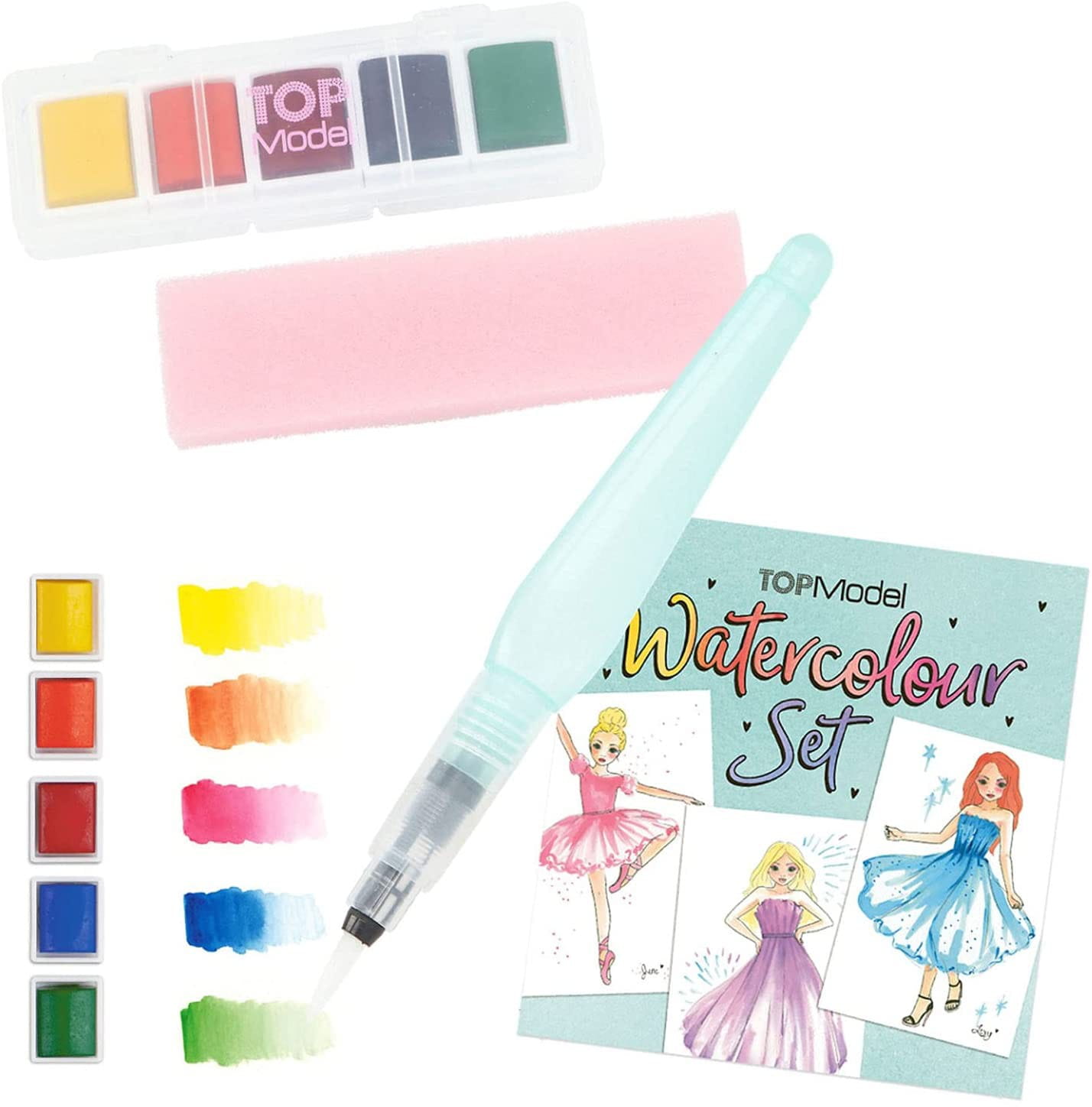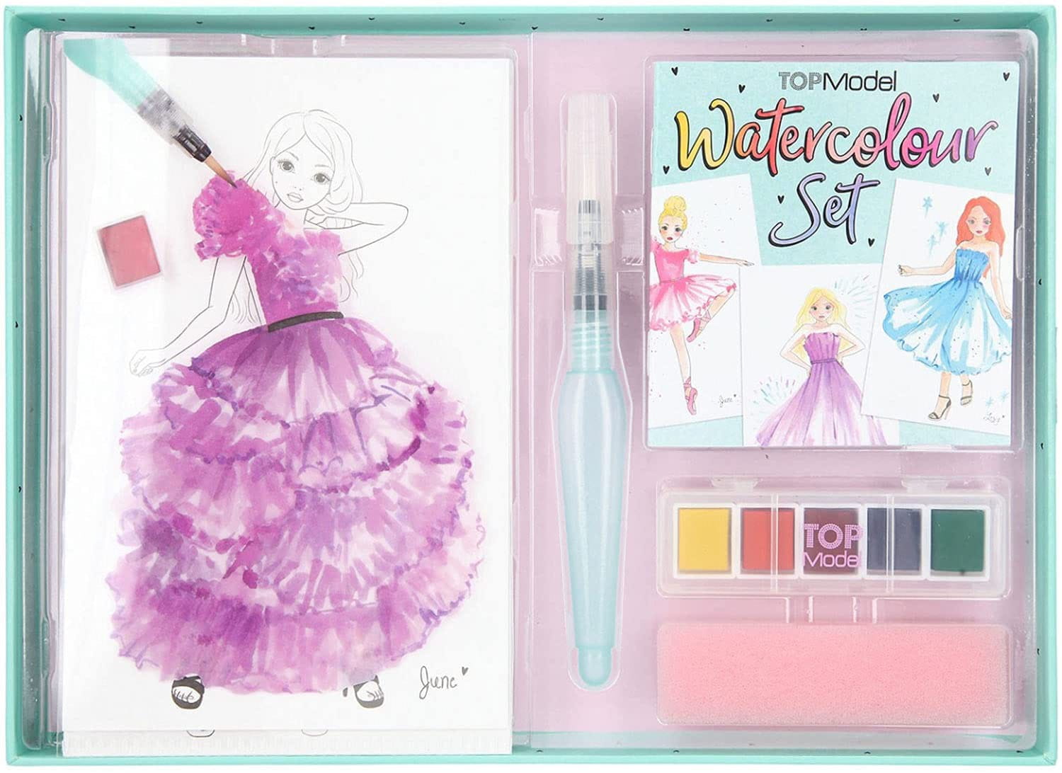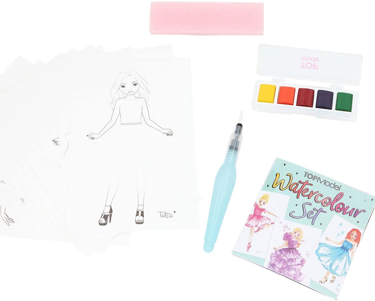 Zestaw do malowania dla dziewczynek z farbami wodnymi Wzór: TOPModel Zawartość: 20 arkuszy papieru akwarelowego z motywami TOPModel, 1 aplikator, 1 mała gąbka i 5 farb akwarelowych w kolorze żółtym, czerwonym, fioletowym, niebieskim i zielonym Aplikator jest wyposażony w mały zbiornik, dzięki czemu można go szybko i łatwo napełnić wodą Wraz z instrukcją