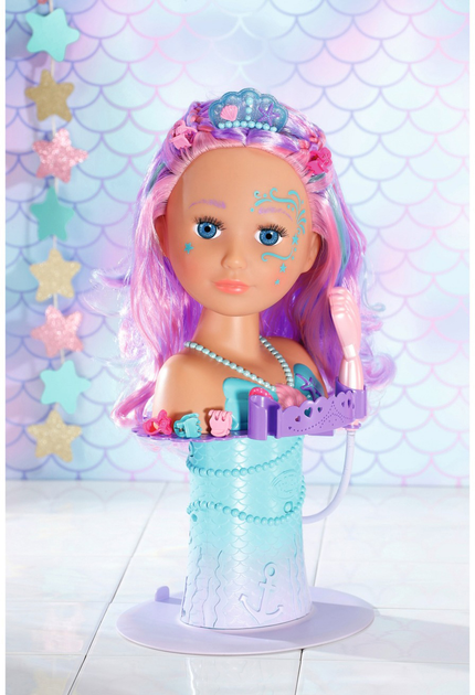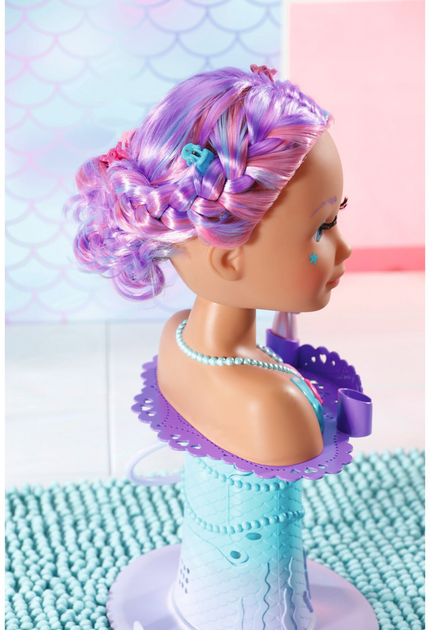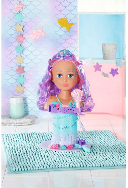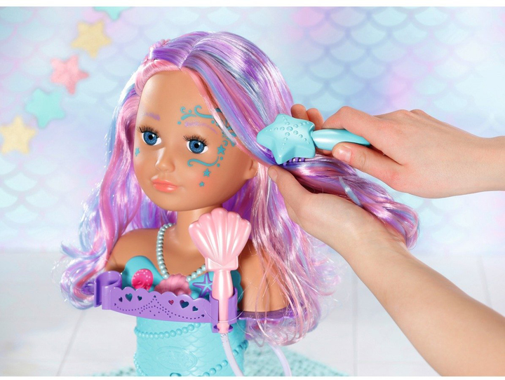 Przenieś zabawę do podwodnego salonu piękności dzięki tej wyjątkowej głowie do stylizacji w kształcie syrenki! To idealny zestaw do zabawy w wannie, który zamienia kąpiel w magiczne doświadczenie. Wystarczy przymocować głowę do gumowej podstawy w wannie, dodać wodę i młody fryzjer jest gotowy do pracy. Farbowane włosy z kolorowymi pasemkami są wysokiej jakości i można je wielokrotnie układać w różnorodne fryzury. Do ozdabiania fryzur w zestawie znajduję się sześć spinek oraz grzebień-diadem. W podstawie głowy znajduje się miejsce do przechowywania tych akcesoriów, a także uchwyty na szczotkę w kształcie rozgwiazdy i prysznic w kształcie muszli. Gdy zdejmiesz prysznic w kształcie muszli z uchwytu, włącza się pompka, a woda zaczyna płynąć — ale tylko wtedy, gdy prysznic naprawdę znajduje się w wodzie. Łatwo obracająca się głowa ozdobiona jest magicznymi wzorami.